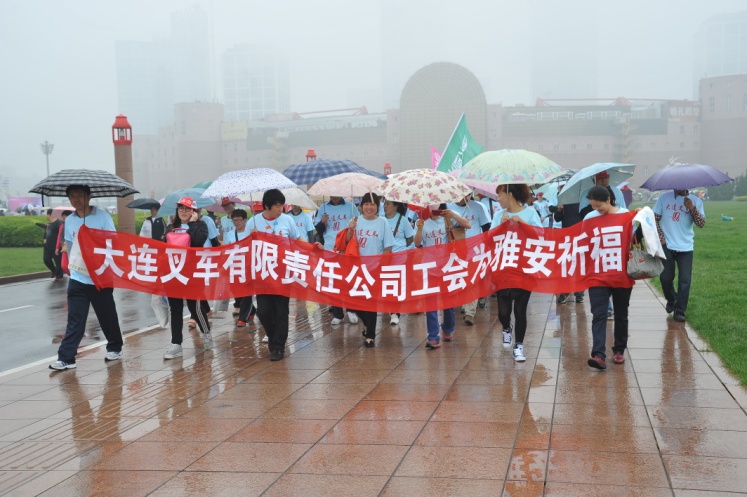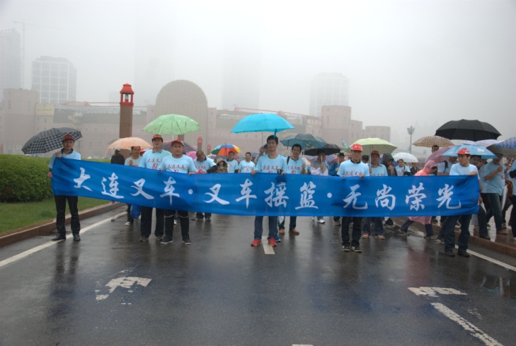 本次徒步大會仍以“健康、和平、交流”為主題,在輕松愉快的徒步過程中,可以收獲健康、傳遞和平,增進(jìn)交流;可以放松精神,愉悅身心,溝通情感。“大連叉車與世界同行、大連叉車向全市人民問好、大連叉車,叉車搖籃,無尚榮光、大連叉車工會為雅安祈福”的大型條幅以及“大連叉車與您共贏、大連叉車與您同行”的小橫幅在細(xì)雨中格外醒目,引來眾多徒步愛好者和攝影愛好者的目光,四面藍(lán)色的廠旗和15面彩色的支會旗迎風(fēng)飄揚,展示著大連叉車朝氣蓬勃的精神風(fēng)貌, 大叉隊伍似一條長龍,蜿蜒在星海灣徒步大會主會場,隊伍中的每個人都昂首挺胸、精神抖擻,無時無刻不展示著作為一名大叉人的那份榮耀和自豪。